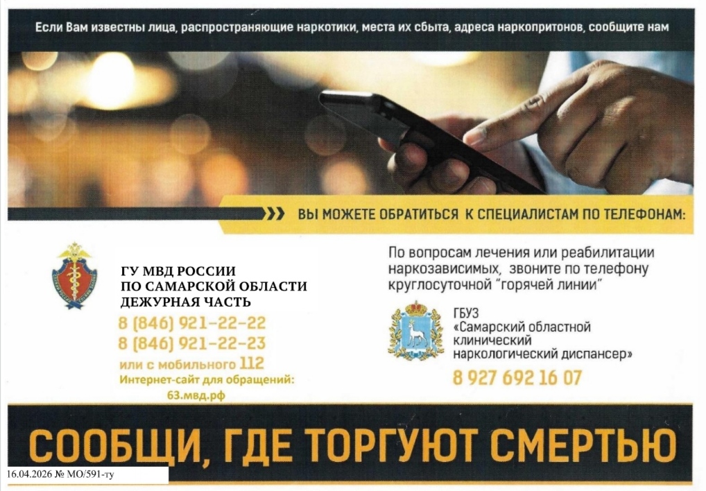 Информацию о преступлениях и правонарушениях в сфере незаконного оборота наркотиков можно сообщить по круглосуточным телефонам дежурной части ГУ МВД России по Самарской области 8 (846) 921-22-22, 8 (846) 921-22-23, в дежурные части территориальных органов внутренних дел или по многоканальному телефону 102, а также на официальный интернет-сайт https://63.мвд.рф через сервис «прием обращений».
